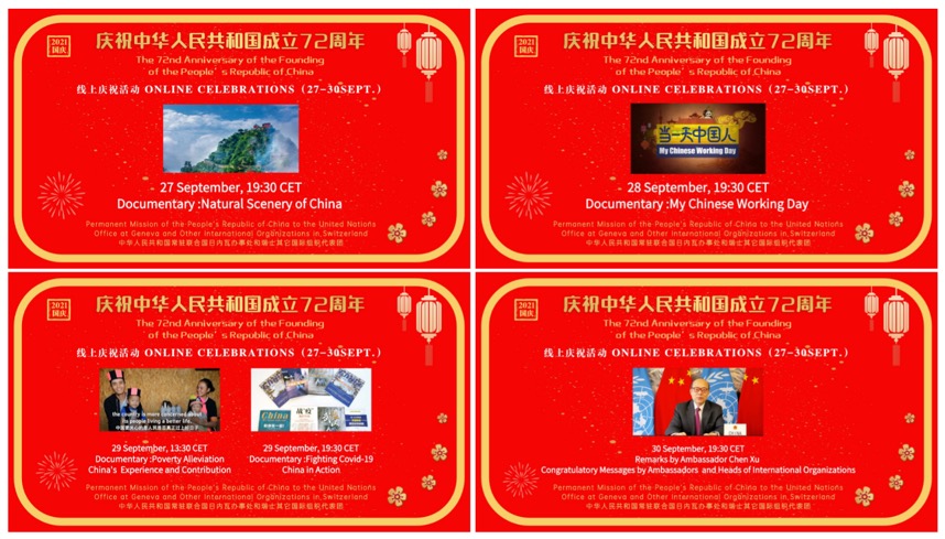 9月27日至30日,中国常驻联合国日内瓦办事处和瑞士其他国际组织代表团举行庆祝中华人民共和国成立72周年线上系列活动。