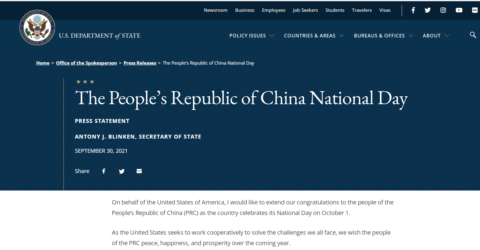 当地时间9月30日,美国国务卿布林肯在国务院网站上发表《中华人民共和国国庆日声明》,布林肯称,10月1日是中国国庆节,他代表美国向中国人民表示祝贺。布林肯表示,在美国寻求合作解决中美共同面临的挑战的同时,祝愿中国人民在未来的一年和平、幸福、繁荣。