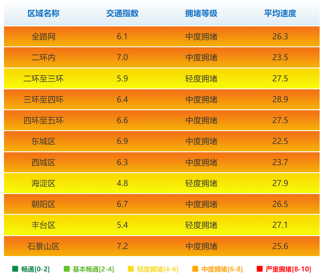 记者注意到,国庆假期首日,北京各条环路和城市主要干线的交通情况尚可,西二环部分路段、东二环北向南、东北四环双向、东五环平房桥至五方桥双向的压力明显,其余道路相对比较畅通。不过,截至10时25分,北京全路网交通指数已达到6.1,属于中度拥堵等级,二环内和石景山区的拥堵指数已达到7.0及以上水平。