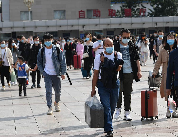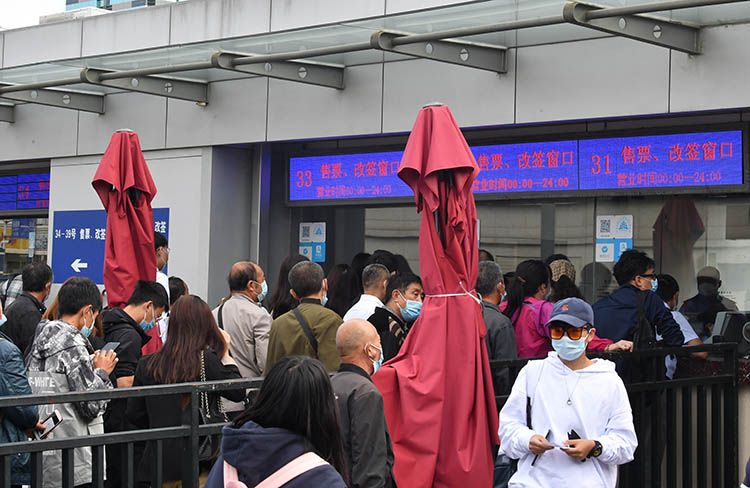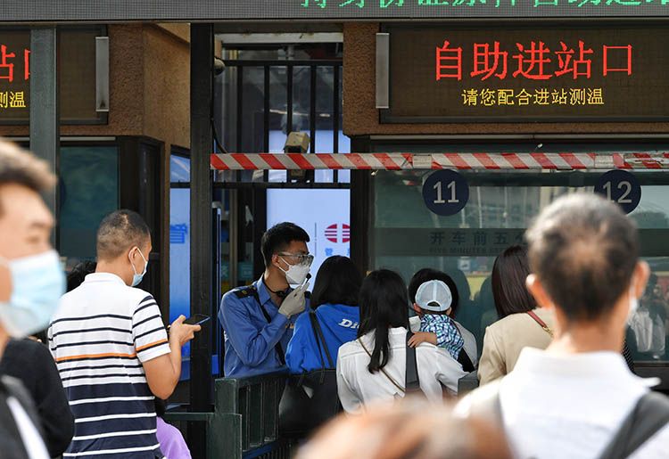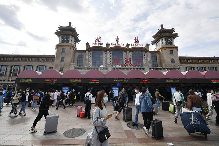 2021年国庆黄金周铁路运输期限为9月28日至10月8日共计11天,北京局集团公司预计发送旅客958万人次,旅客出行高峰日为10月1日,今天预计发送旅客120 万人次,客流主要以济南、郑州、太原、沈阳、西安、上海、大同、包头、呼和浩特等方向为主,京津冀区域内京广高铁、京张高铁各站出行需求旺盛。目前,北京铁路要求所有进站旅客必须先扫描“北京健康码”,同时要佩戴口罩、分散就座,并保持安全距离。图为:北京站,出京旅客准备进站。
