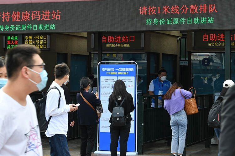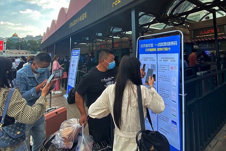 北京站进站口,旅客正在扫描“北京健康宝”。