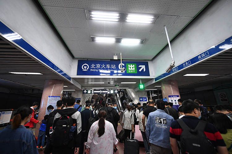 黄金周期间,北京局集团公司管内各条线路均按高峰图组织运力,在此基础上将加开84.5对旅客列车,安排重联列车73对。同时,北京市郊铁路S1线、S2线、S5线及京承线开行旅客列车25对,预计发送2.3万人。图为:地铁北京站站台,乘客出站换乘火车。