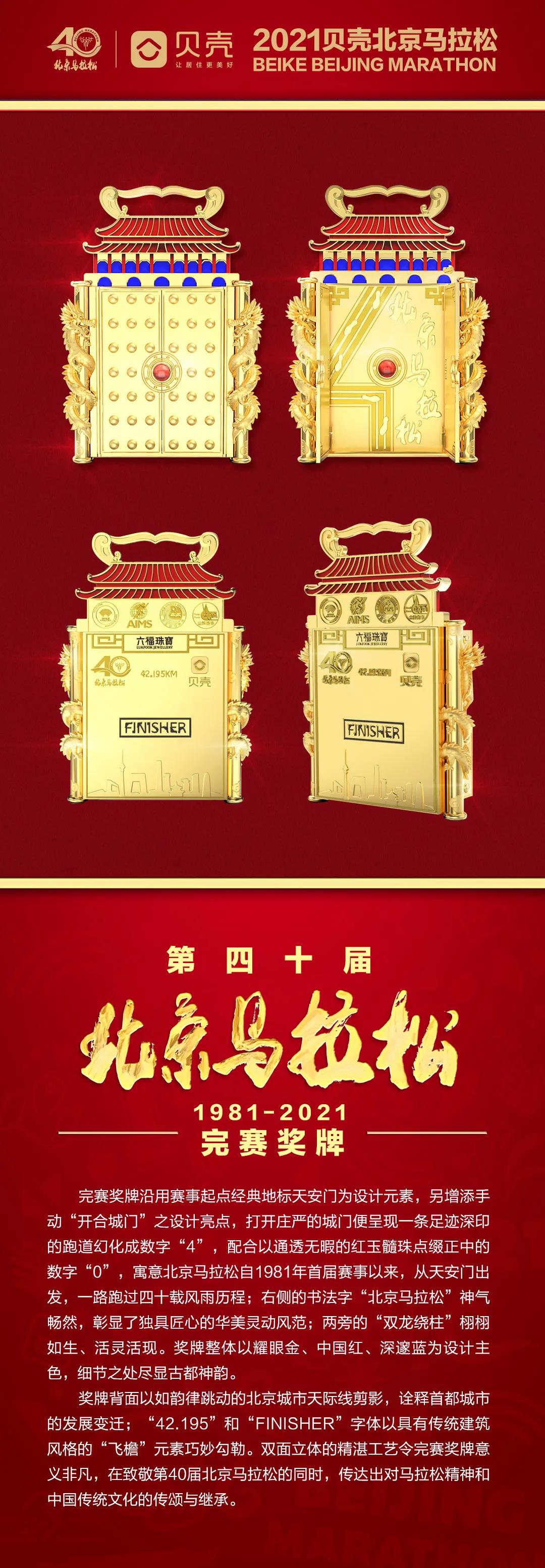 第四十届北京马拉松完赛奖牌由六福珠宝专业团队倾情打造。完赛奖牌沿用赛事起点经典地标天安门为设计元素,另增添手动“开合城门”之设计亮点,打开庄严的城门便呈现一条足迹深印的跑道幻化成数字“4”,配合以通透无暇的红玉髓珠点缀正中的数字“0”,寓意北京马拉松自1981年首届赛事以来,从天安门出发,一路跑过四十载风雨历程;右侧的书法字“北京马拉松”神气畅然,彰显了独具匠心的华美灵动风范;两旁的“双龙绕柱”栩栩如生、活灵活现。奖牌整体以耀眼金、中国红、深邃蓝为设计主色,细节之处尽显古都神韵。