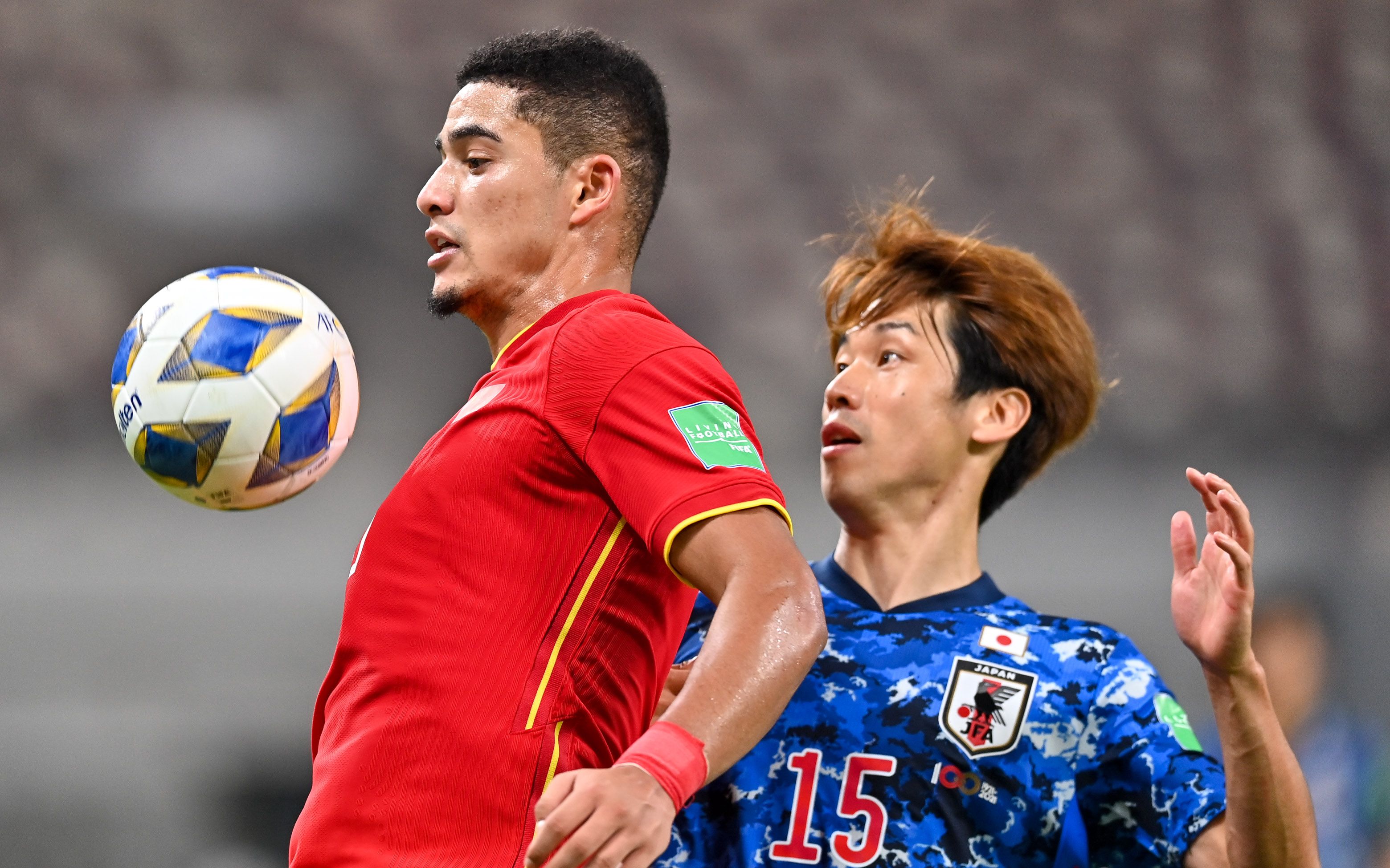 12强赛中,蒋光太(左)与日本队球员大迫勇也争抢。图/新华社