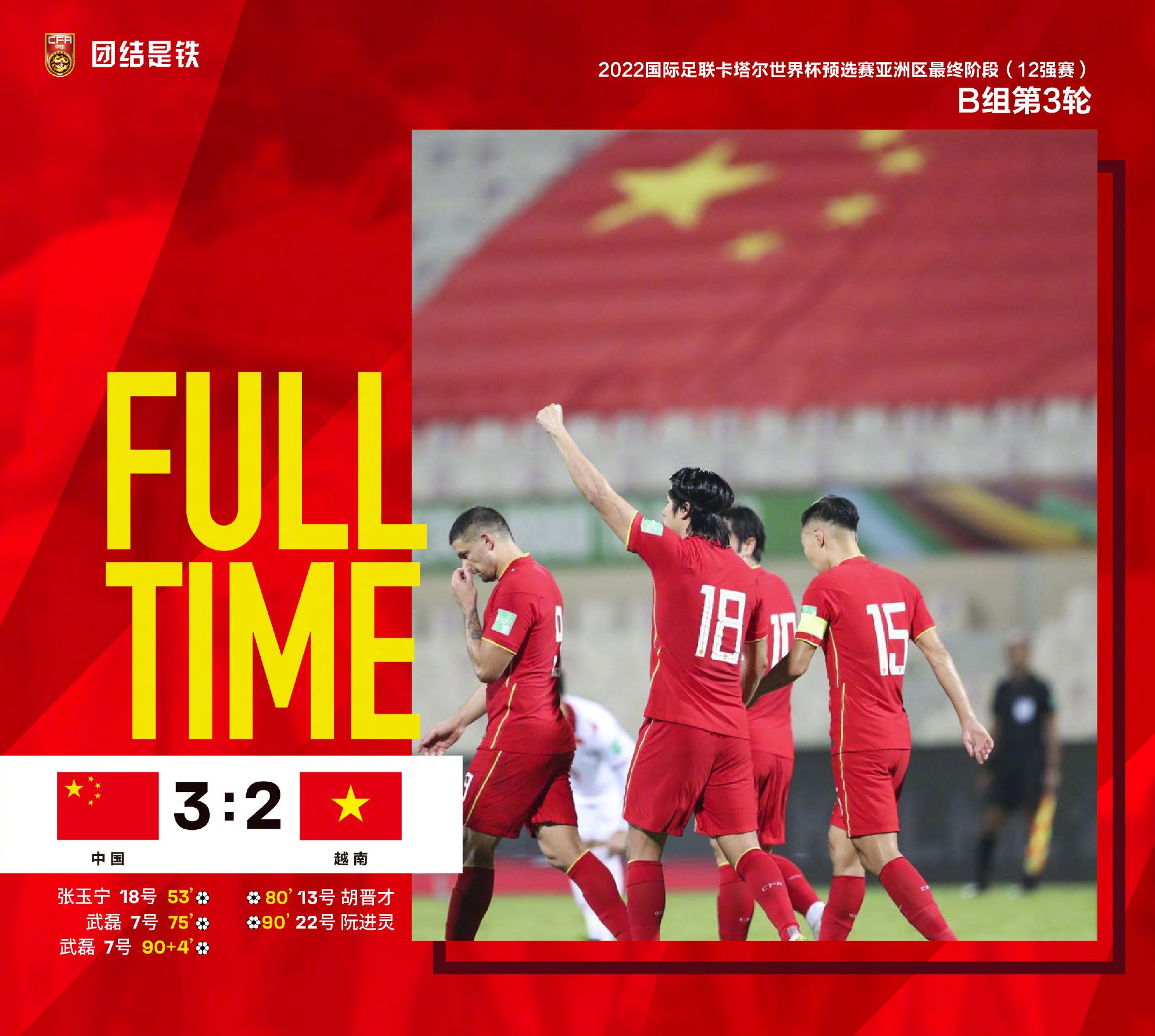 上半时抢开局未能奏效的国足在下半场开局阶段收到成效,第52分钟,球队后场策动攻势,尽管武磊的单刀被越南队门将扑出,但张玉宁补射得手,打破场上僵局的同时,为中国队收获了12强赛首个进球。李铁此后做出人员调整,阿兰、韦世豪与蒿俊闵换下艾克森、张稀哲和刘彬彬,继续保持进攻力度。第74分钟,武磊接王燊超的助攻头槌破门,将比分扩大为2比0。