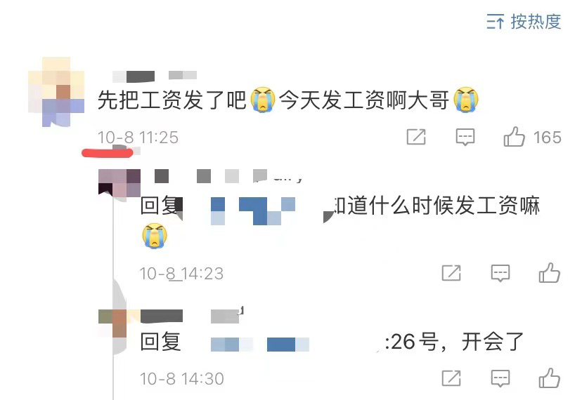 贝壳财经记者看到,当天,不仅张熙微博留言出现催债信息,“精锐创始人称自己倾家荡产”的热搜词条下,不少员工表示希望今天可以顺利发工资。评论发出三个小时后,有员工称自己收到财务通知,工资延迟到26日发出。