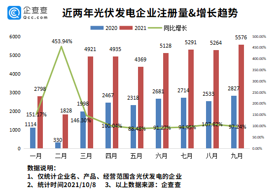 企查查数据显示,2021年前8月,我国共新增光伏发电相关企业4.01万家。最近的9月新增光伏发电相关企业5576家,同比增长97.24%。7月、8月分别新增光伏发电相关企业5291家、5264家。