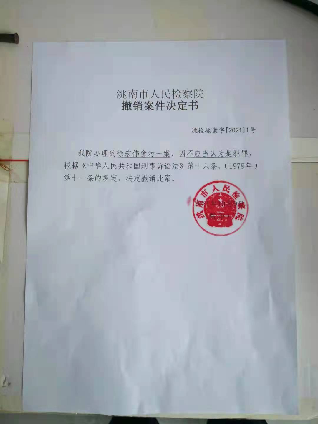 9日下午,洮南市人民检察院作出撤案决定书,称徐宏伟贪污一案,不应当认为是犯罪。