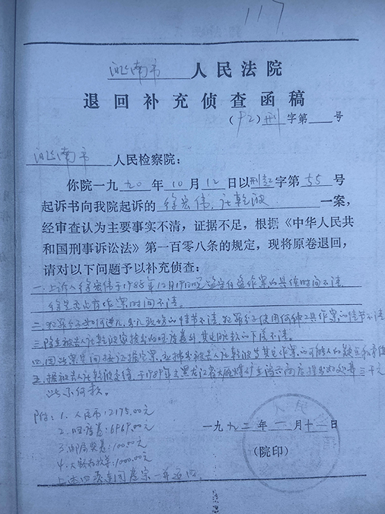 1992年1月11日,洮南市人民法院作出的退回补充侦查函稿。受访者供图