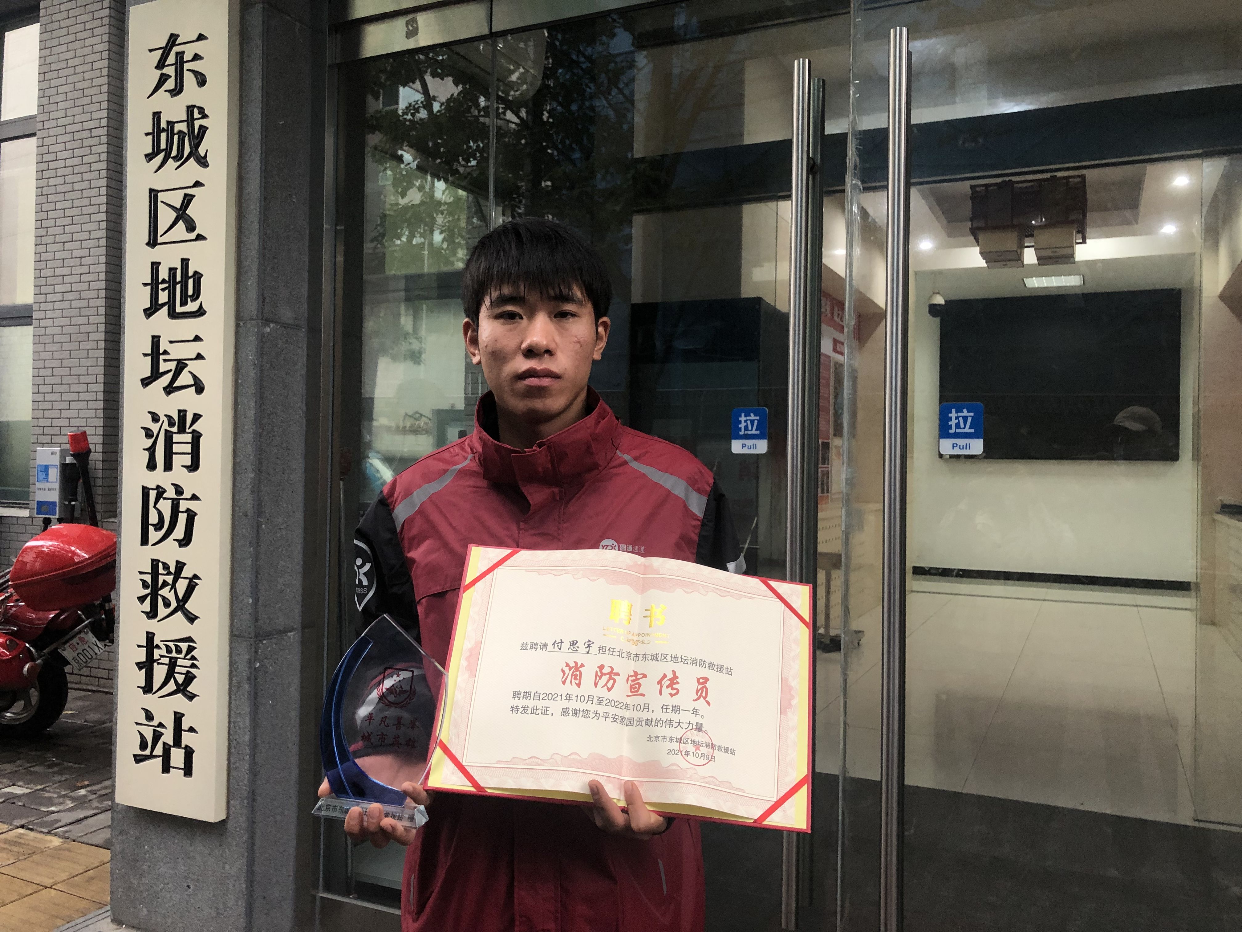 10月9日,在东城区地坛消防救援站,被找到的付思宇受邀来参观并被聘为消防宣传员。来北京当快递员的第五个月,这位东北小伙子将自己上了新闻的事儿告诉家人,奶奶乐坏了。