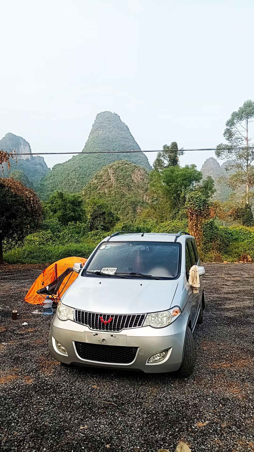 ▲10月2日晚间至10月3日清早,贺湘闽、梁成露宿在广西阳朔一农家乐边,梁睡在车内,贺睡在车旁的帐篷中。受访者供图