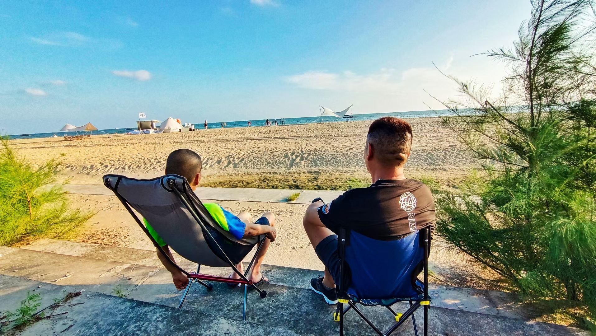 ▲10月3日傍晚,贺湘闽、梁成二人在防城港的海滩边。受访者供图