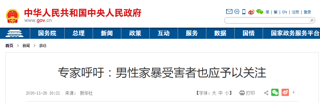 ▲早在2016年就有专家呼吁关注男性家暴受害者。图/中国政府网截图