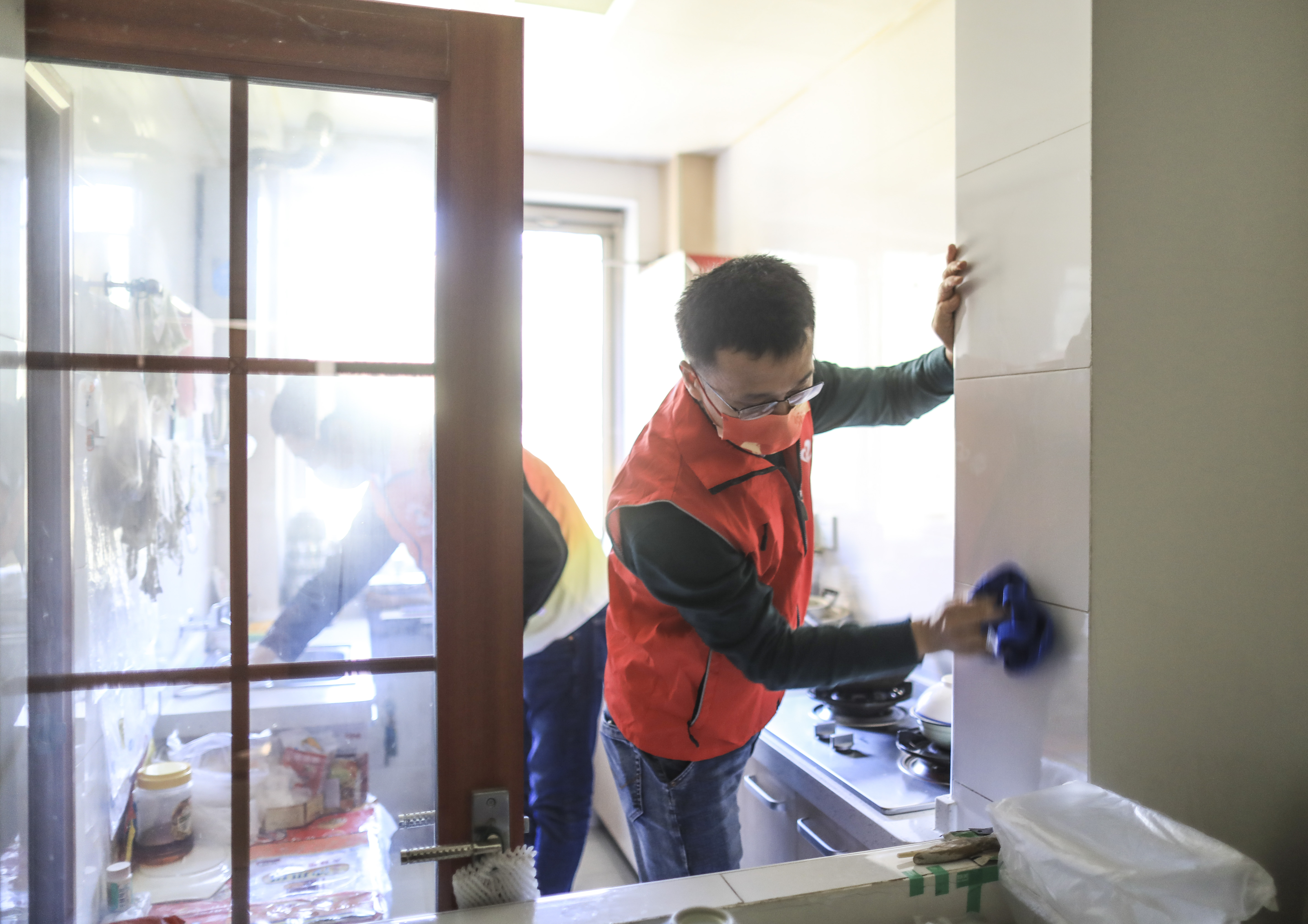 志愿者在93岁的卢喜明老人家中做家务。新京报记者 浦峰 摄