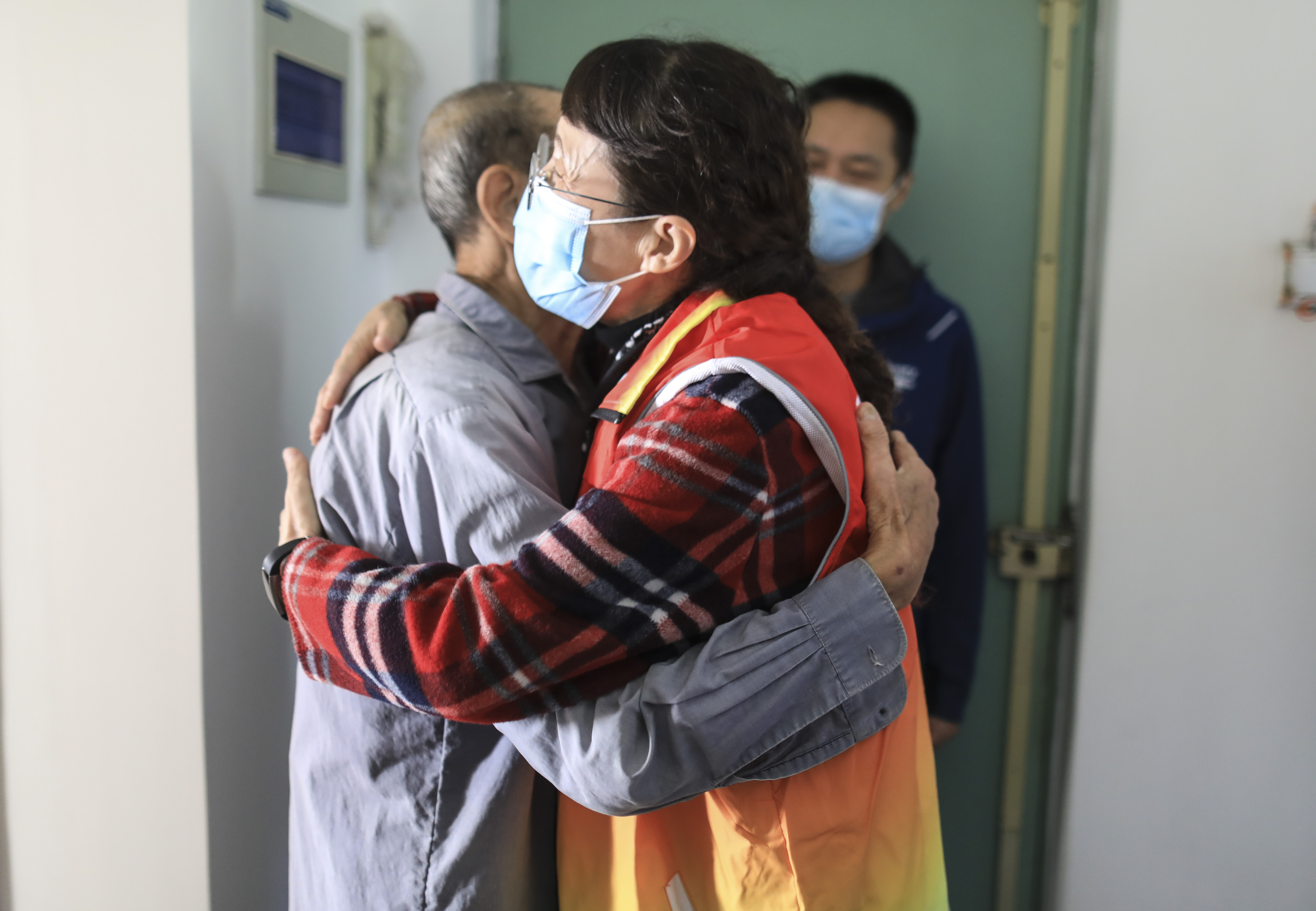 志愿者和93岁的卢喜明老人进行“拥抱”服务。新京报记者 浦峰 摄