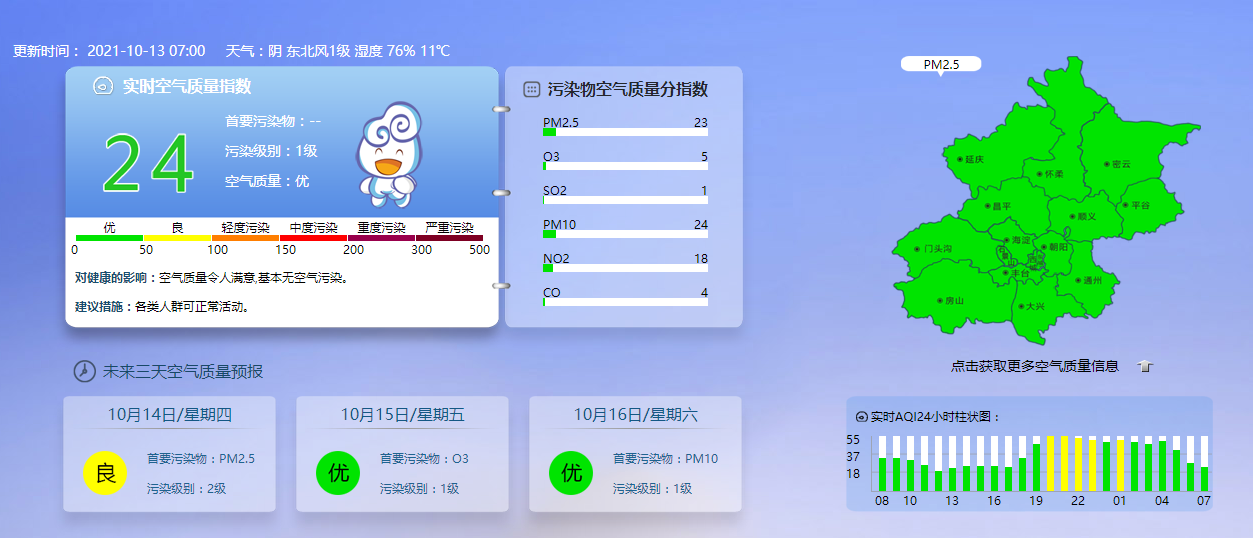 据北京市生态环境监测中心今早7时数据,目前实时空气质量指数24,污染级别1级,空气质量为优。