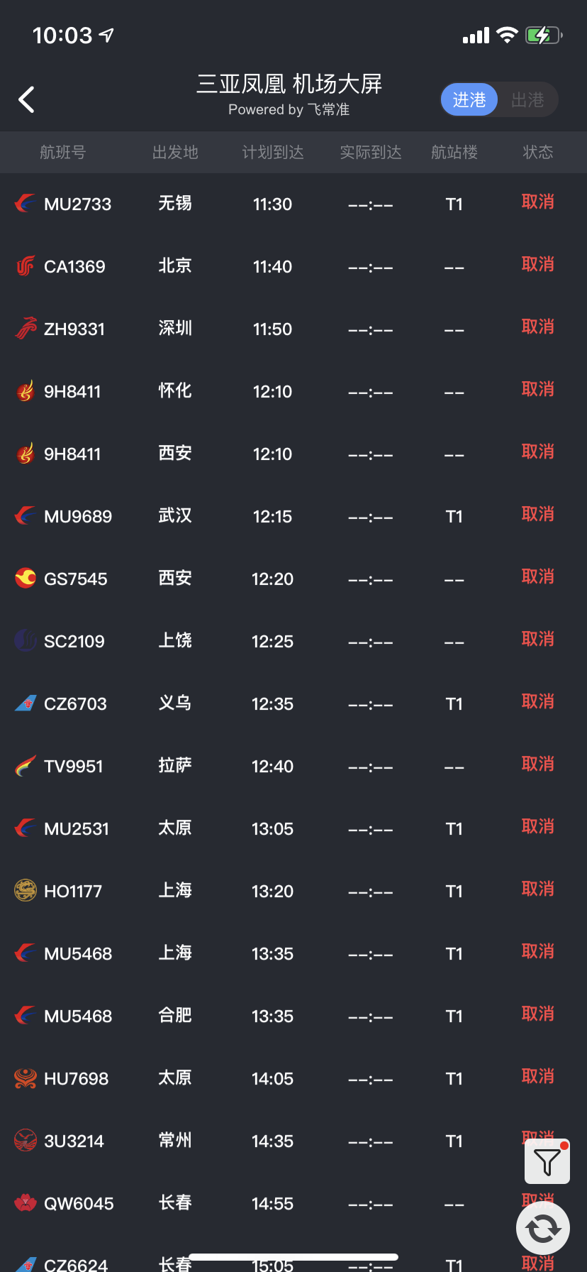 三亚凤凰机场10月13日航班取消。图源:飞常准APP