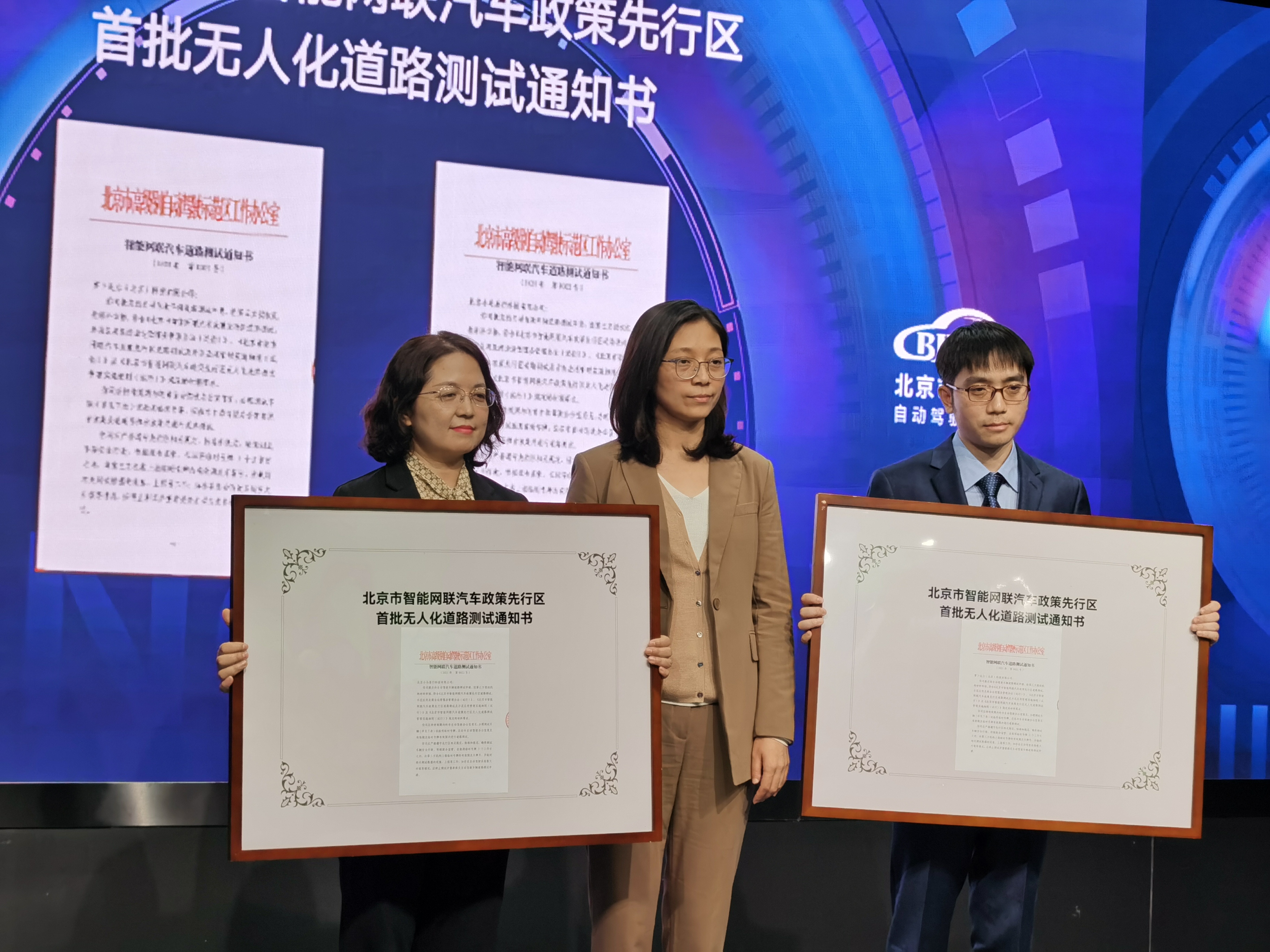 新京报快讯(记者 陈琳)10月15日,位于北京经济技术开发区的北京市智能网联汽车政策先行区(简称政策先行区)正式开放无人化测试场景,首批为百度、小马智行两家企业颁发北京市智能网联汽车政策先行区无人化道路测试通知书。