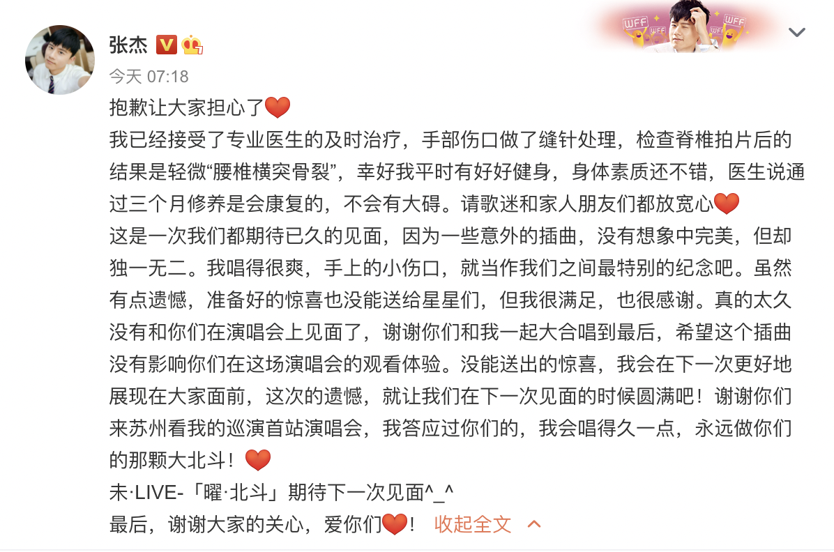 张杰演唱会意外摔伤,发文报平安:三个月后会康复