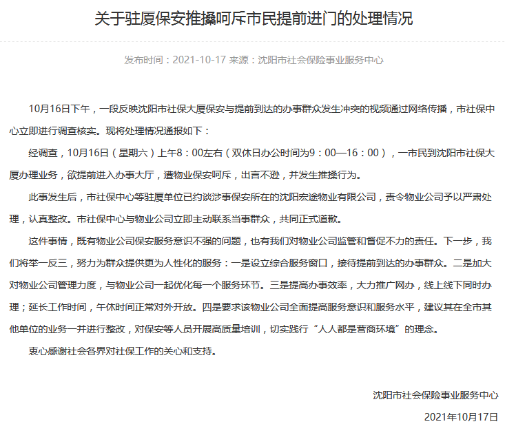 据了解,保安系大厦物业人员,沈阳社保事业服务中心已就此事致歉,并表示将认真整改。另据沈阳宏途物业公司回应,涉事保安已被开除。
