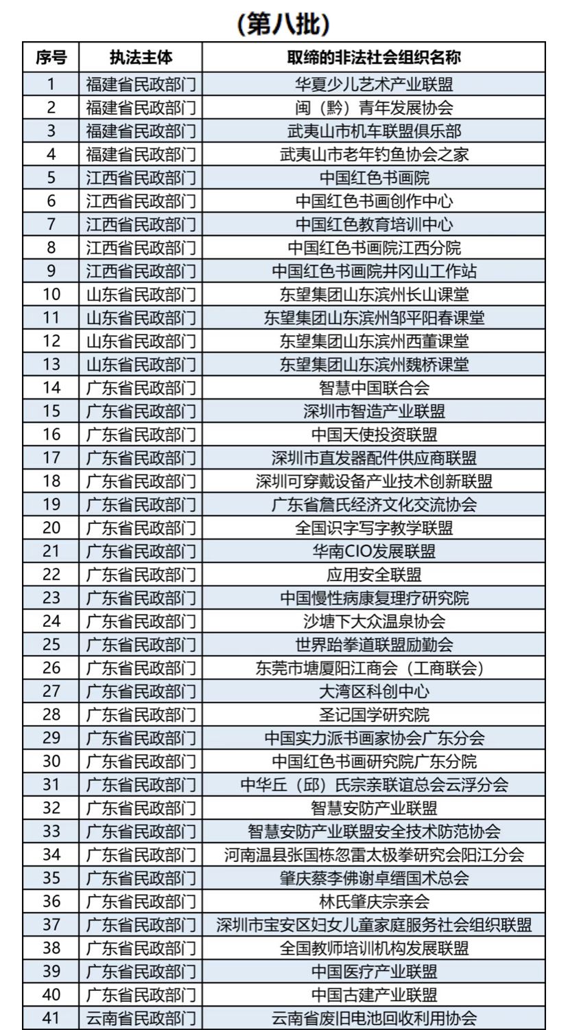 新京报快讯 据中国社会组织动态官微消息,为持续加大舆论宣传力度,提高公众防范意识,发挥社会监督作用,现向社会公布第八批地方民政部门近年来依法取缔的部分非法社会组织名单。社会公众如果发现名单中的非法社会组织仍在开展活动的,可依法向公安机关报案。同时,提醒有关机构和社会公众,在与社会组织开展合作或参与其活动时,请通过“中国社会组织政务服务平台”(www.chinanpo.gov.cn)、“中国社会组织动态”政务微信(微信号:chinanpogov)核实其身份,避免上当受骗;也欢迎社会各界通过“中国社会组织政务服务平台”提供涉嫌非法社会组织活动线索。