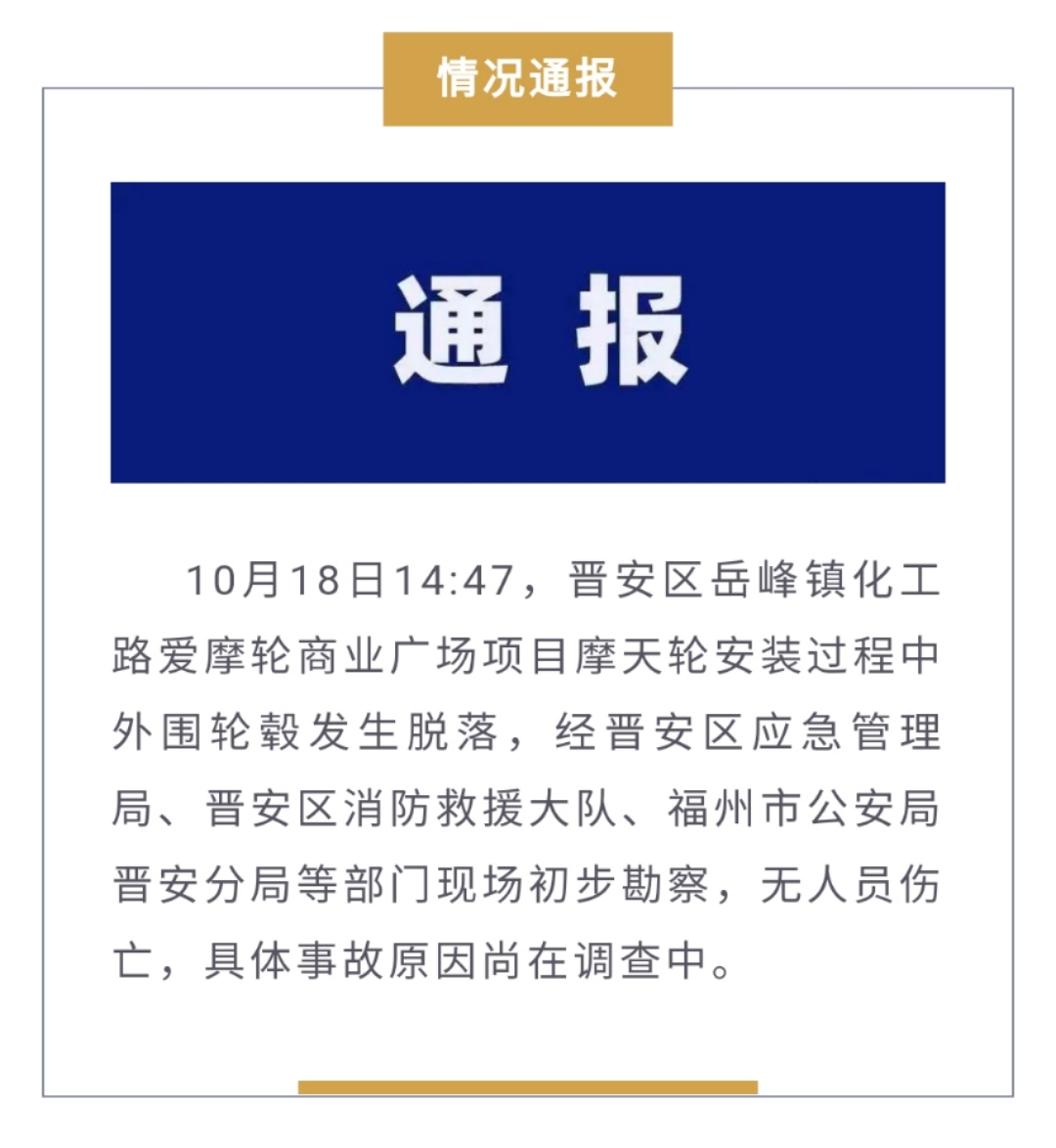 晋安区人民政府也通过微信公众号发布通报称,10月18日14时47分,晋安区岳峰镇化工路爱摩轮商业广场项目摩天轮安装过程中外围轮毂发生脱落,经晋安区应急管理局、晋安区消防救援大队、福州市公安局晋安分局等部门现场初步勘查,无人员伤亡,具体事故原因尚在调查中。