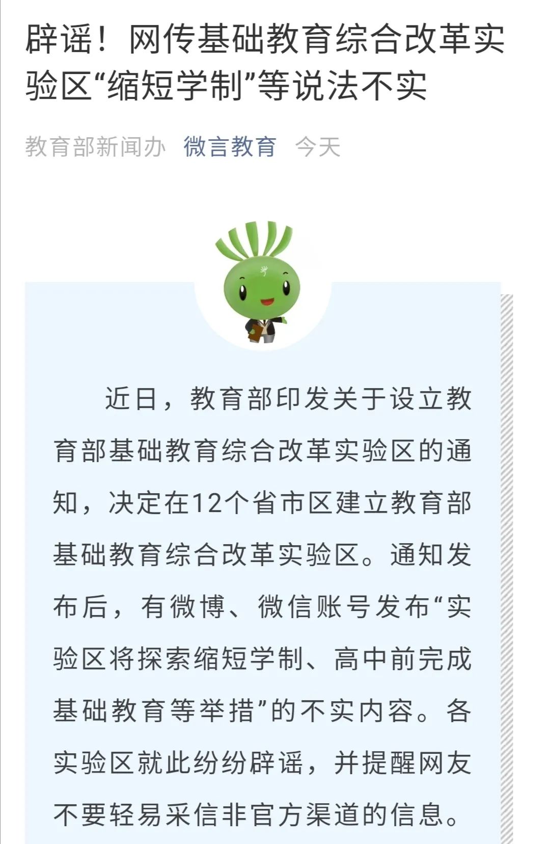 在此次传言中,我国要设立基础教育综合改革实验区的消息是真实的,但“缩短学制,改为9年义务教育,小学4年、初中3年、高中2年,取消小升初,高中前完成基础教育”“中考分特色考试”“普及高中,高中分特高、普高、职高”等内容,则有网络炮制的嫌疑。