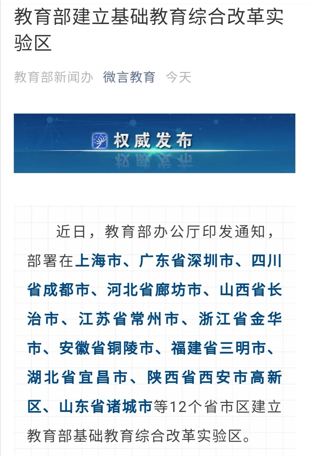 ▲10月18日,教育部官微“微言教育”同时发布了“教育部建立基础教育综合改革实验区”的消息,但改革内容并不涉及学制变动。图/“微言教育”公号截图