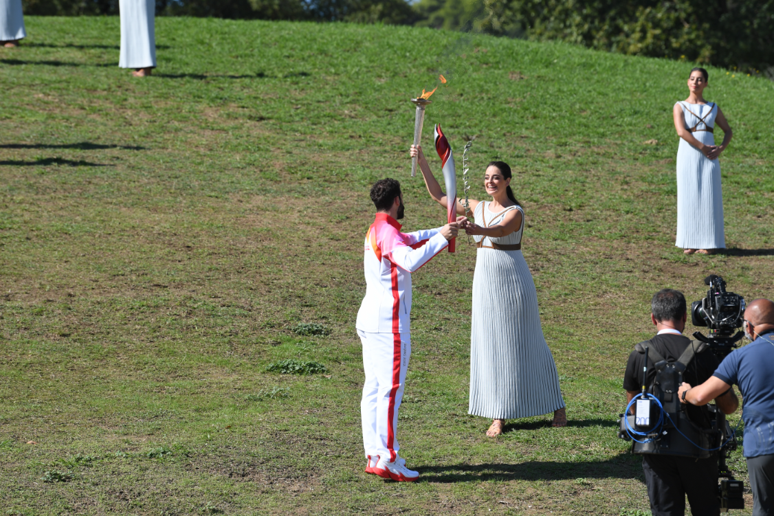 在一段舞蹈表演后,最高女祭司将燃起的火炬及象征和平与荣耀的橄榄枝传递给第一棒火炬手——手持北京冬奥会火炬“飞扬”的希腊高山滑雪运动员扬尼斯·安东尼乌(Ioannis Antoniou)。