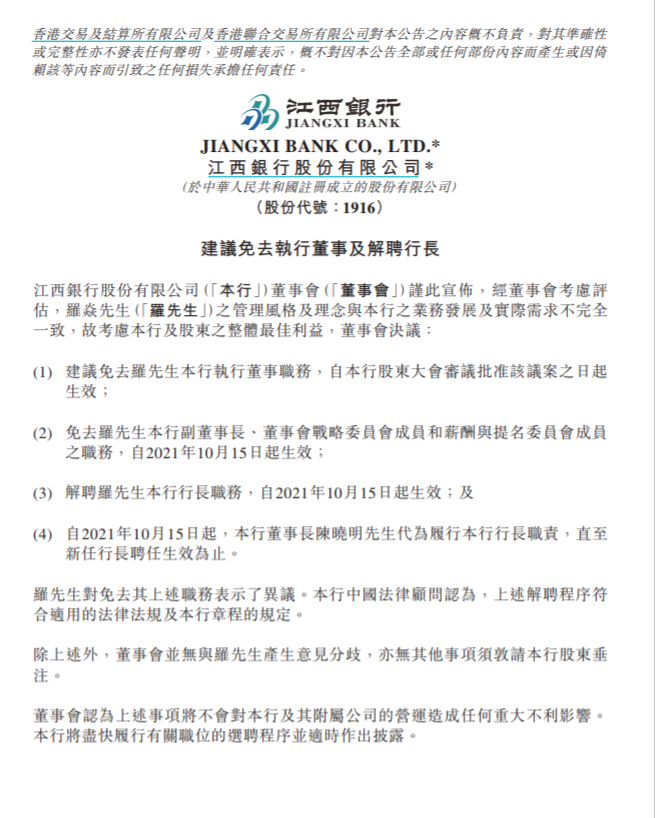 新京报贝壳财经讯(记者 黄鑫宇)近日,在港上市的江西银行股份有限公司(1916.HK,下称“江西银行”)公告称,经董事会考虑评估,行长罗焱的管理风格、理念与全行业务发展及实际需求不完全一致,决议免去其执行董事、副董事长等职务,并解聘其行长职务。记者查询招股书发现,罗焱也是该行2018年6月在香港联交所上市以来的首任行长。