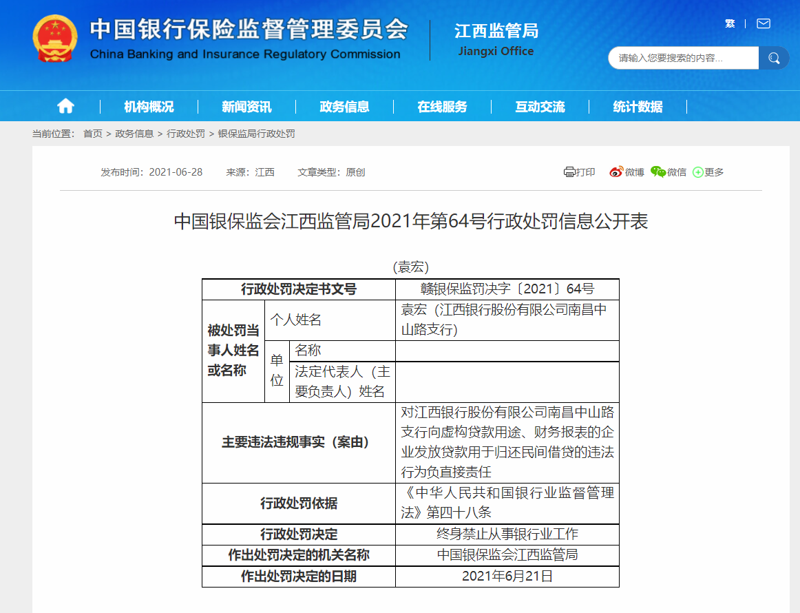据记者统计,截至10月17日,今年以来,江西银行体系接到全国各地银保监局或分局开出的罚单共26张(包括个人);其中一人因“对向虚构贷款用途、财务报表的企业发放贷款用于归还民间借贷的违法行为负直接责任”而被终身禁业(如图2所示)。