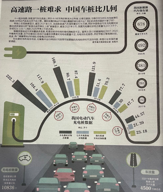 截至2021年9月,我国新能源汽车保有量达678万辆,同时中国电动汽车充电基础设施促进联盟给出的“联盟内成员单位上报”数据显示,截至2021年9月,我国充电基础设施总数量为222.3万个。车桩比为3.05:1,相比2020年有上升的态势。