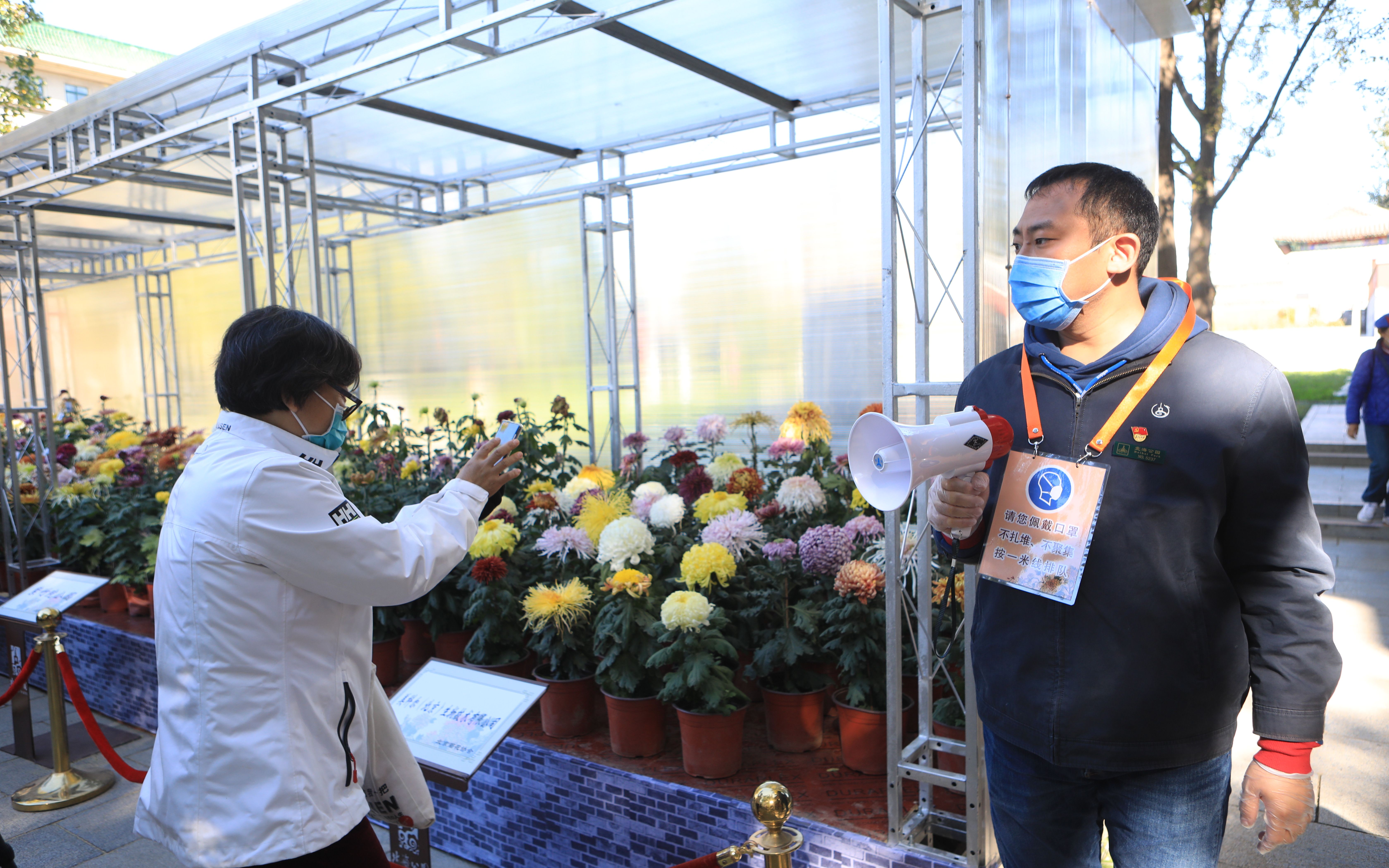 菊花展所在景区采取限流措施,如遇观览高峰请配合工作人员的疏导,按1米线耐心排队等候。