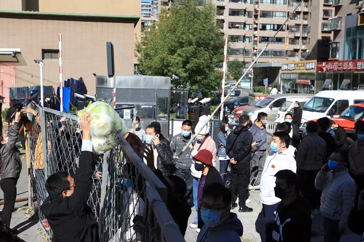 现场一买菜平台配送员介绍,今天早上6点开始,平台一直在接收该小区的订单,到今天中午已经积压了两千多单,“现在我们站点只能一辆车一辆车往这西南门口送,目前为止果蔬肉类还算充足。”