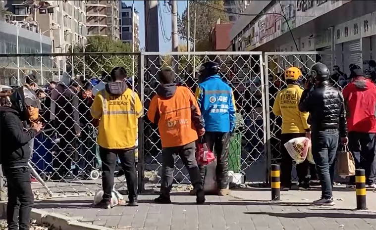 宏福苑小区分为南区、中区和北区。22日午间,新京报记者探访宏福苑南区发现,小区已实行封闭管理,小区住户在核酸检测点排队等候检测,外卖员、快递员和果蔬配送员聚集在北门配送物资。