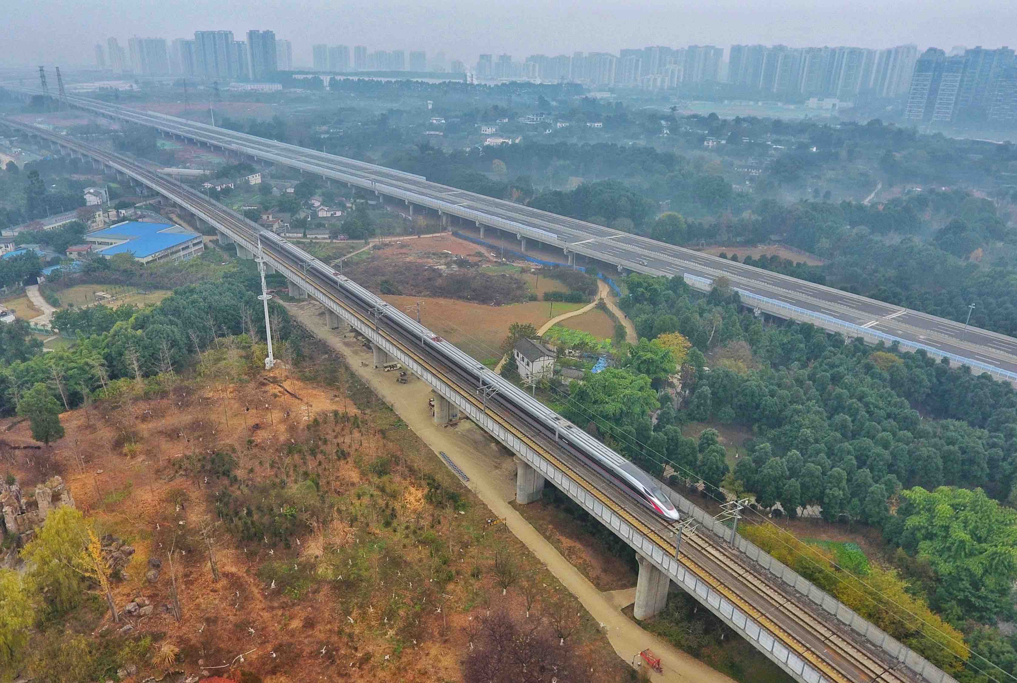 ▲“复兴号”高铁列车从成都东站出发开往重庆沙坪坝。新华社记者 刘坤 摄
