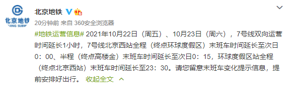 北京地铁:22日、23日7号线双向运营时间延长1小时