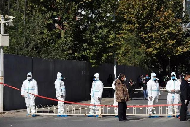 ▲10月22日中午,北京昌平区北七家宏福苑南区南门,防疫人员正在实施封控管理。图/新京报记者 王嘉宁摄