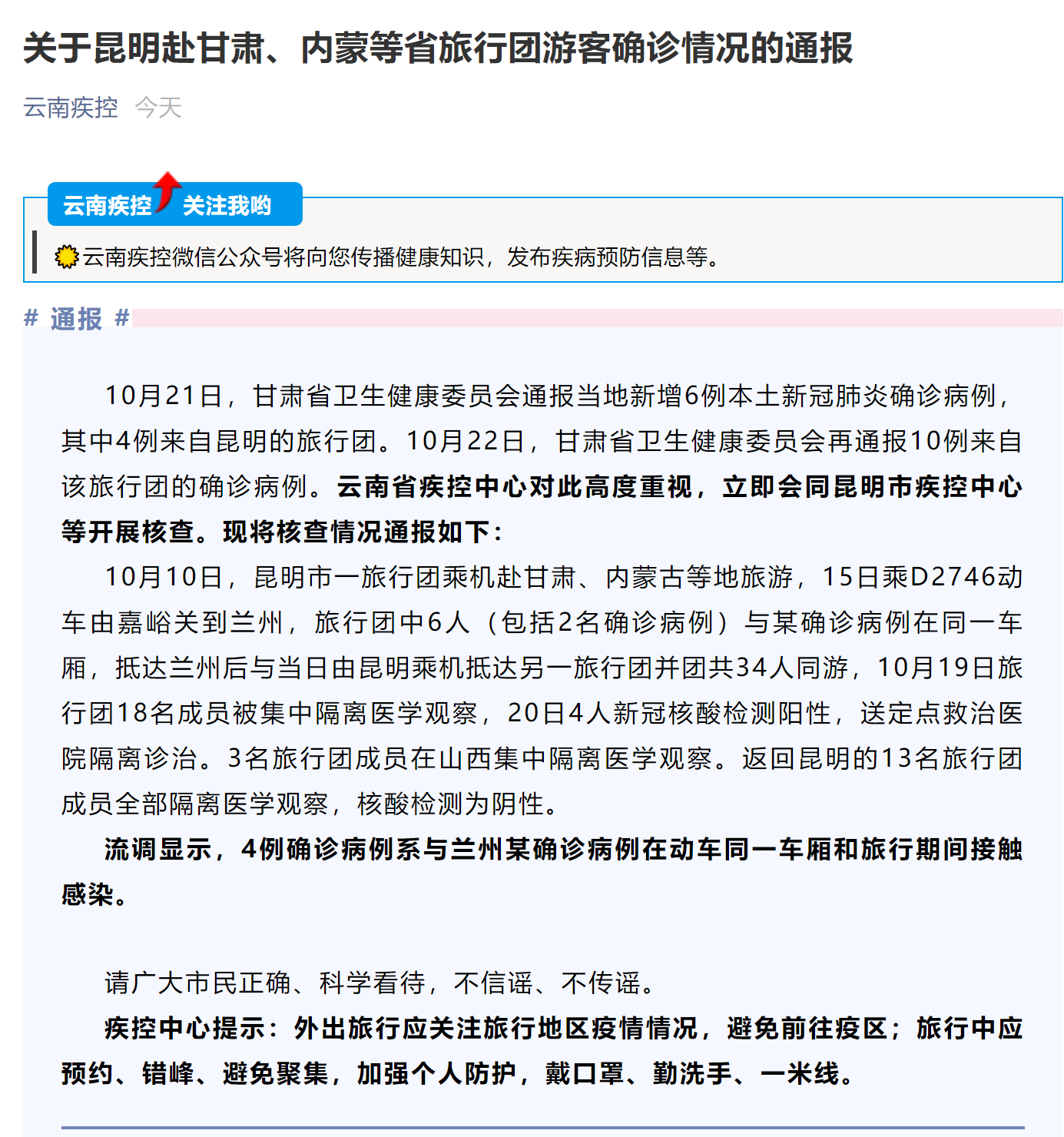 10月10日,昆明市一旅行团乘机赴甘肃、内蒙古等地旅游,15日乘D2746动车由嘉峪关到兰州,旅行团中6人(包括2名确诊病例)与某确诊病例在同一车厢,抵达兰州后与当日由昆明乘机抵达另一旅行团并团共34人同游,10月19日旅行团18名成员被集中隔离医学观察,20日4人新冠核酸检测阳性,送定点救治医院隔离诊治。3名旅行团成员在山西集中隔离医学观察。返回昆明的13名旅行团成员全部隔离医学观察,核酸检测为阴性。