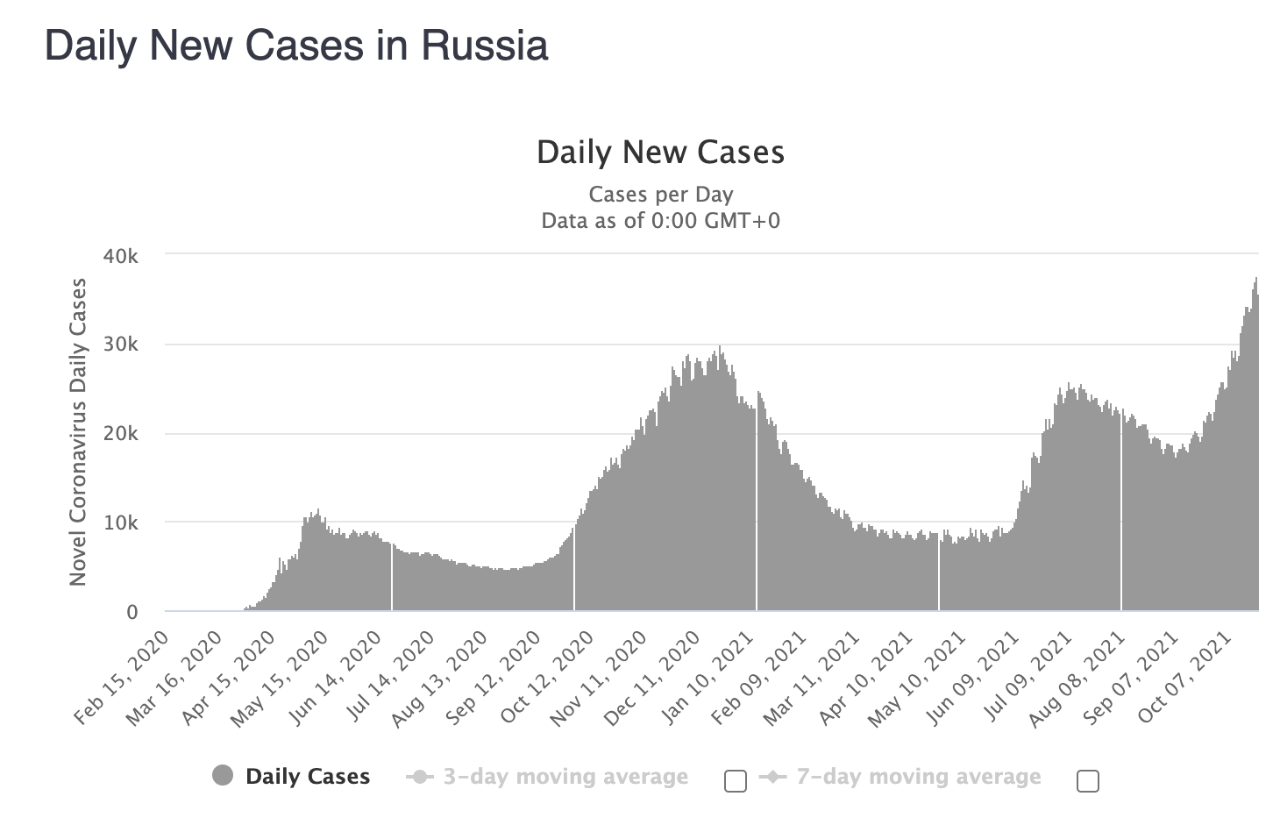 俄罗斯的第三波疫情和全球第三波疫情大致同步,主要是受到“德尔塔”变异病毒的影响。然而,在全球疫情自8月末开始缓和的同时,俄罗斯疫情却出现上升趋势,且日增确诊病例持续突破此前纪录。