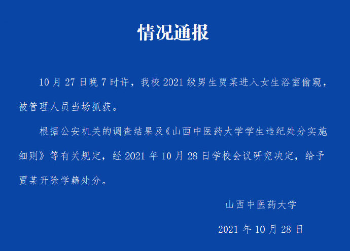 新京报快讯 针对山西中医药大学女浴室有男生混入拍视频一事,山西中医药大学官方微博发布情况通报,全文如下: