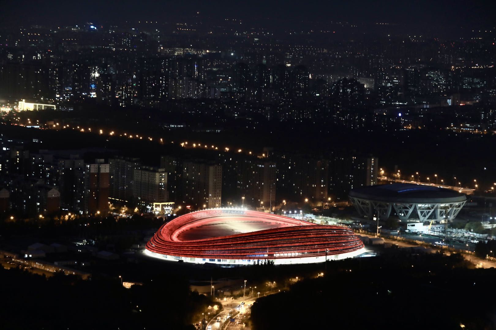10月28日晚,“冰丝带”在夜色中首次点亮景观灯。新京报记者 浦峰 摄