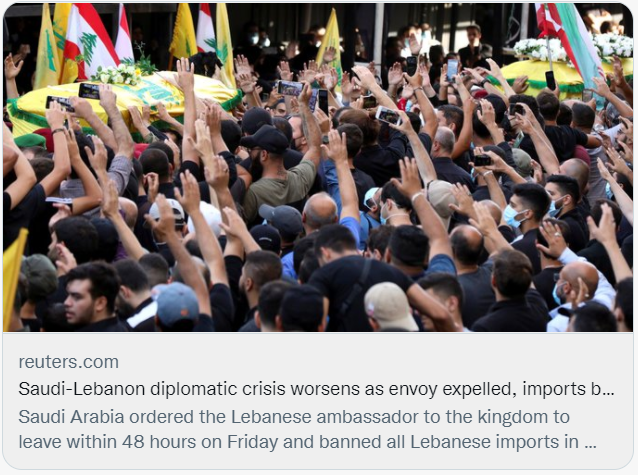 紧接着事态升级,当地时间10月29日,沙特政府要求黎巴嫩驻沙特大使48小时内离境,同时召回驻黎巴嫩大使并暂停进口黎巴嫩商品。随后,巴林、科威特以及阿联酋纷纷采取类似外交行动,声援沙特。