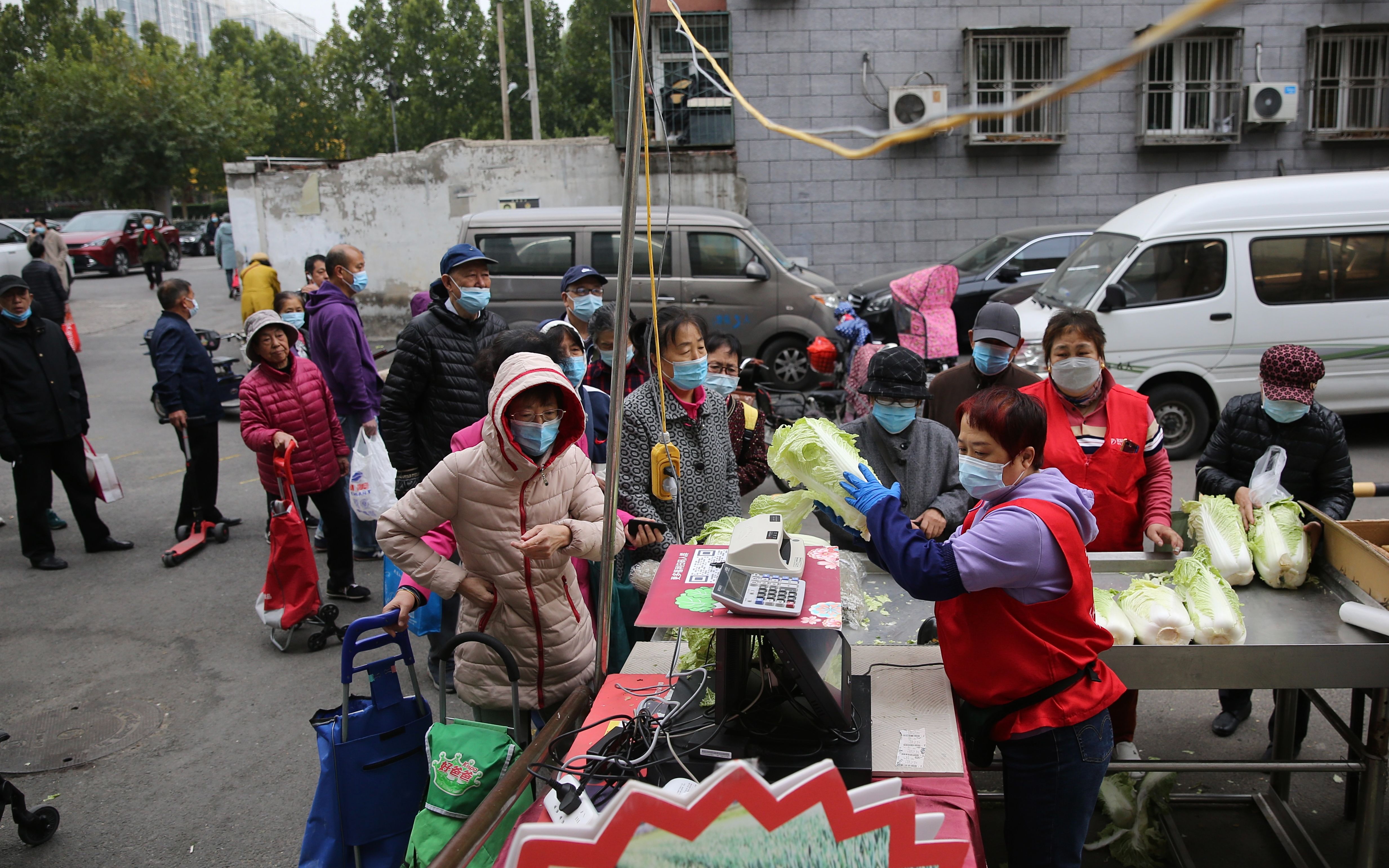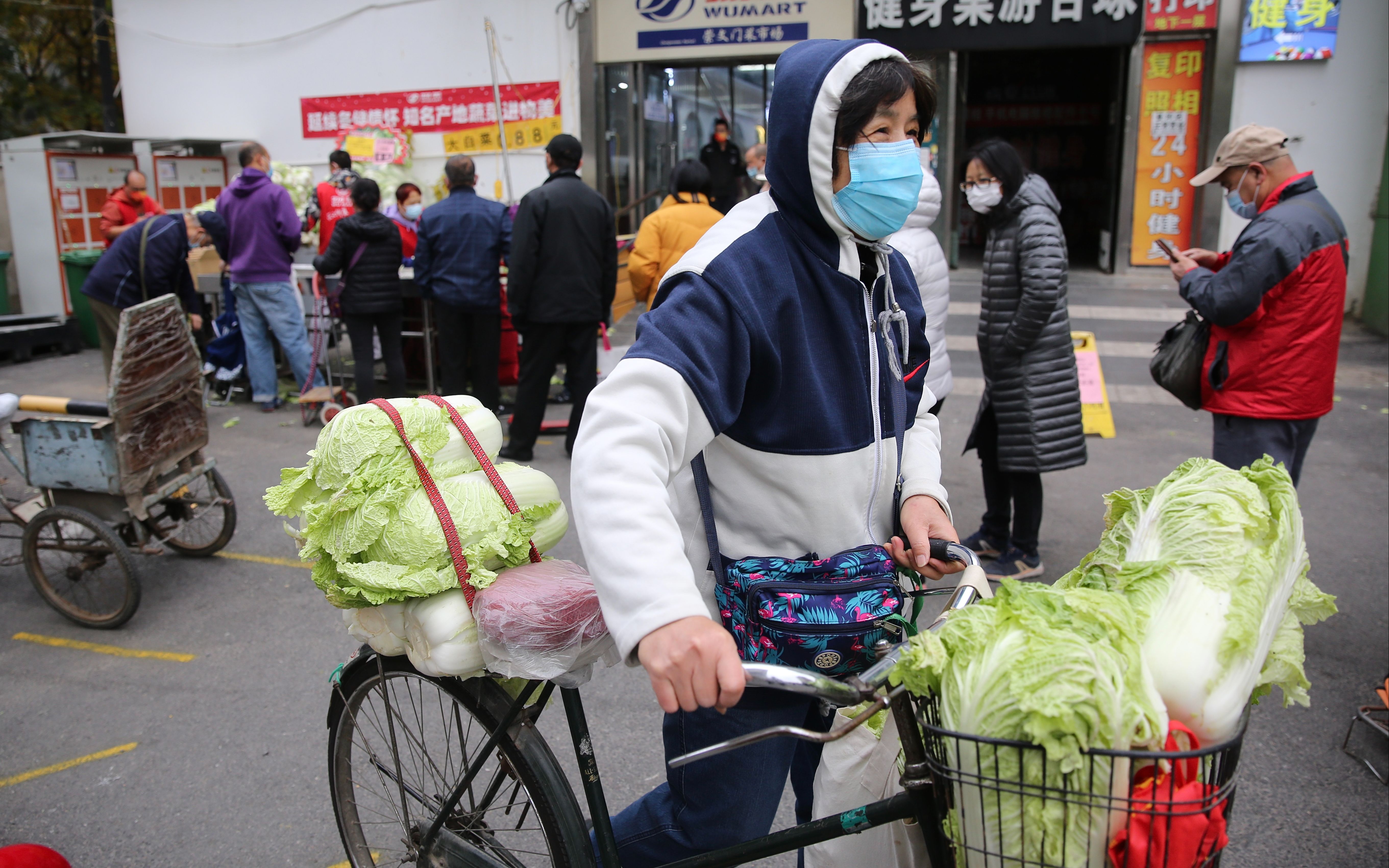 11月1日一早,崇文门菜市场物美店门口,市民排队购买冬储大白菜。新京报记者 郑新洽 摄
