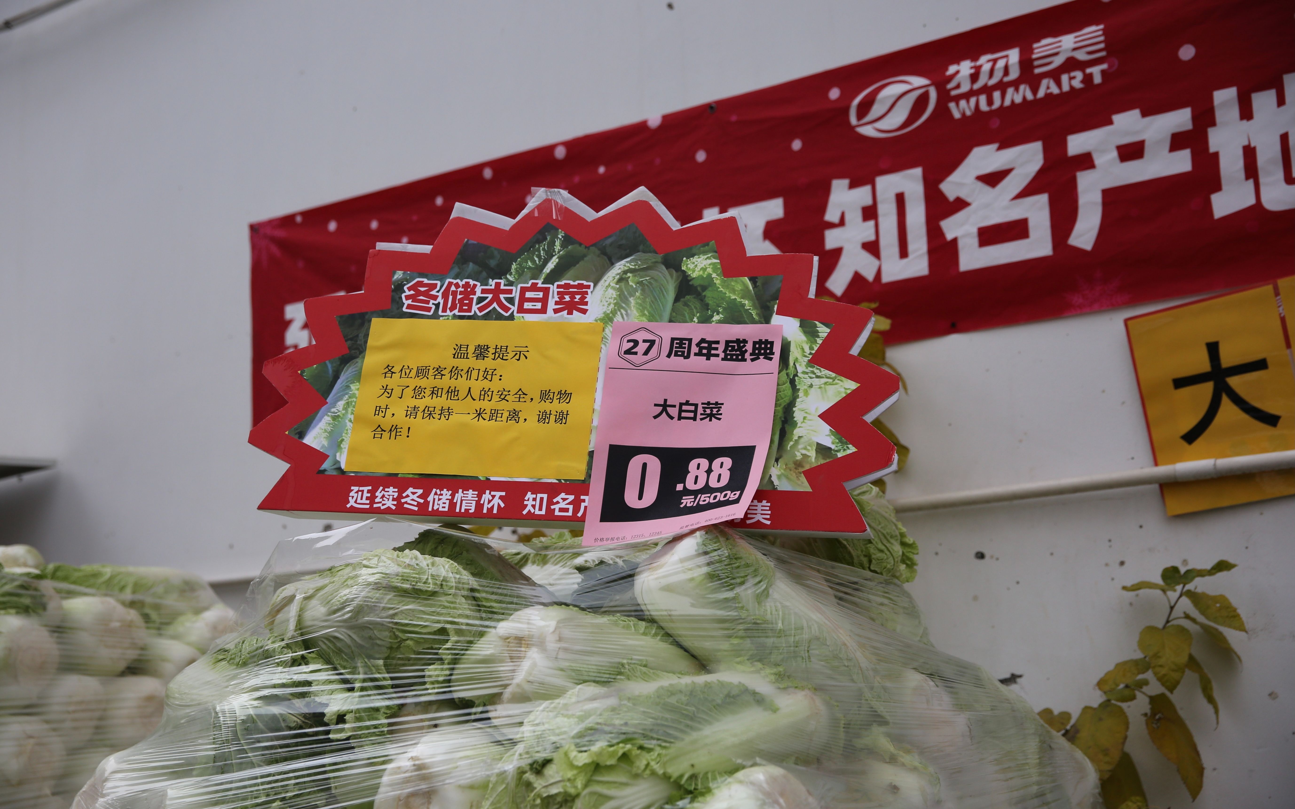 大白菜标价牌旁贴着防疫提示。新京报记者 郑新洽 摄