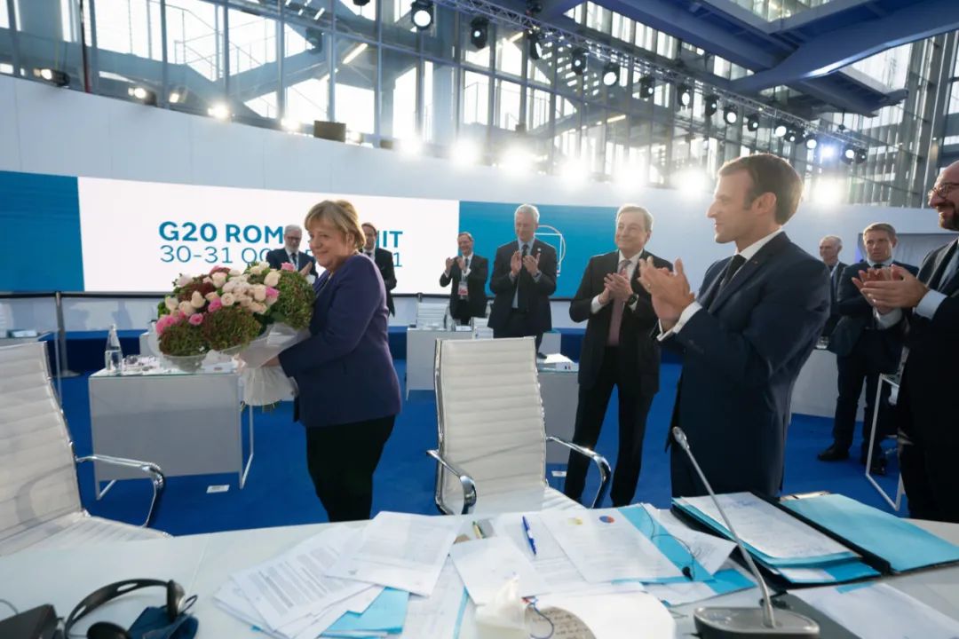 当地时间2021年10月31日,意大利罗马,G20领导人第十六次峰会举行,默克尔手捧鲜花。图/IC photo