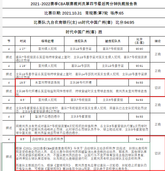 CBA联盟以裁判报告的形式回应场上争议。网络截图