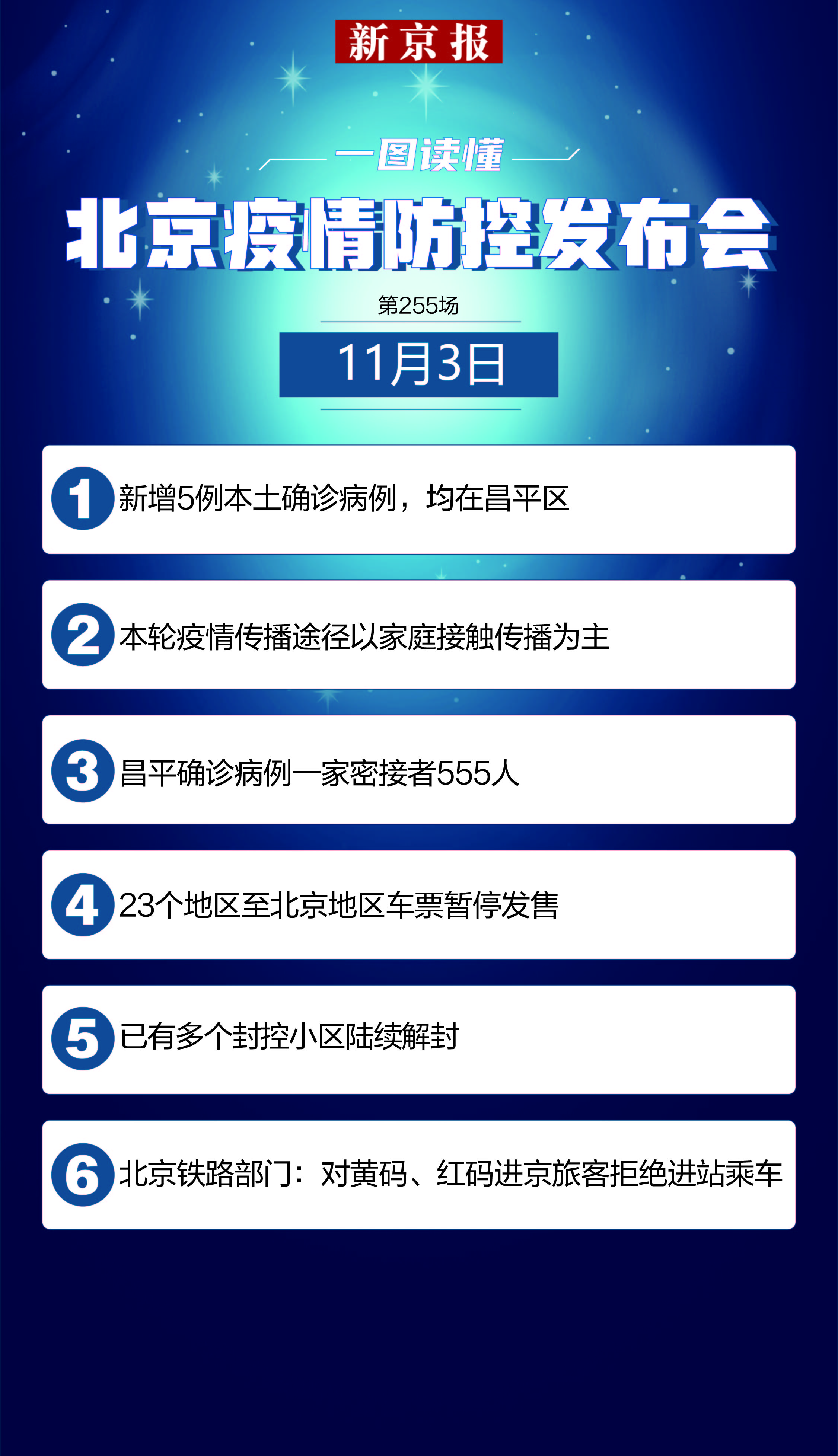 11月3日下午,北京召开新冠疫情防控第255场新闻发布会,通报疫情最新进展。据通报,11月2日12时至3日14时,北京新增5例本土新冠肺炎确诊病例。这些病例去过哪里?哪些地区的进京车票暂时停售?一起来看……