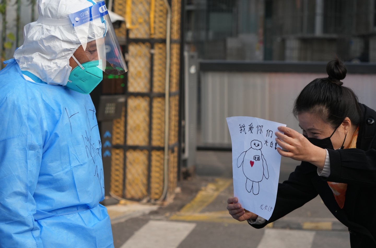 11月3日,丰台恒富中街6号院,解封后居民给值守的工作人员送上小朋友创作的感谢字画。新京报记者 陶冉 摄