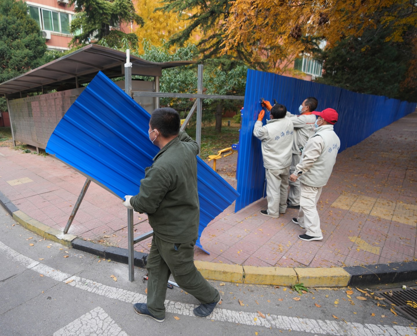 11月3日,丰台怡海花园,工作人员拆除围挡。新京报记者 陶冉 摄